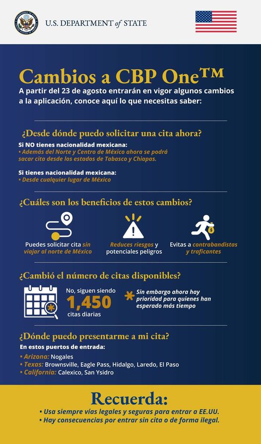 “A partir del 23 de agosto, que ya casi estamos ahí, se van a implementar de Chiapas y Tabasco para el norte, entonces va a ser toda la República mexicana, con que estés en esa área ya vas a poder meterte a la CBP One App y hacer la aplicación para asilo”, explicó un oficial de CBP.