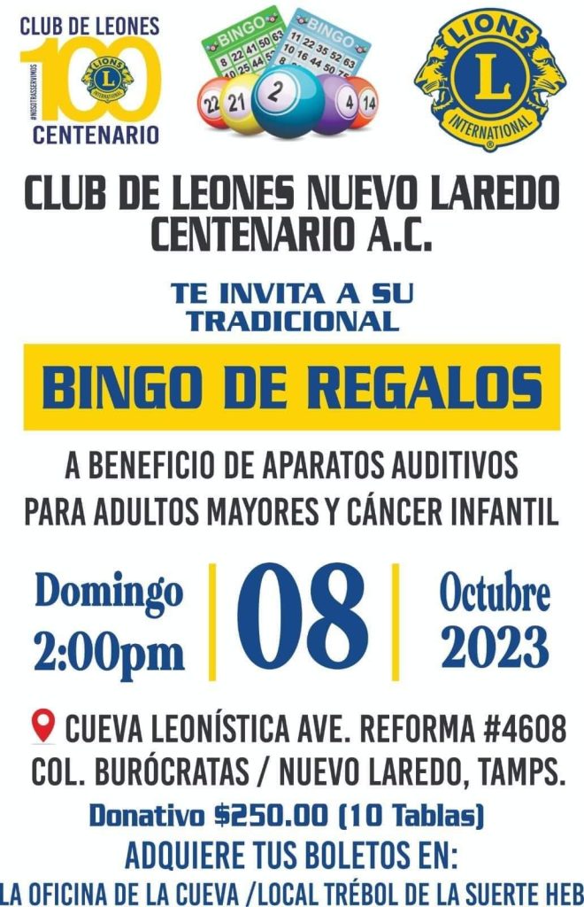 NUEVO LAREDO.- El Club de Leones Centenario invita a su tradicional bingo de regalos que se realizará este domingo ocho de octubre con grandes premios, principalmente muebles para el hogar y la oficina.