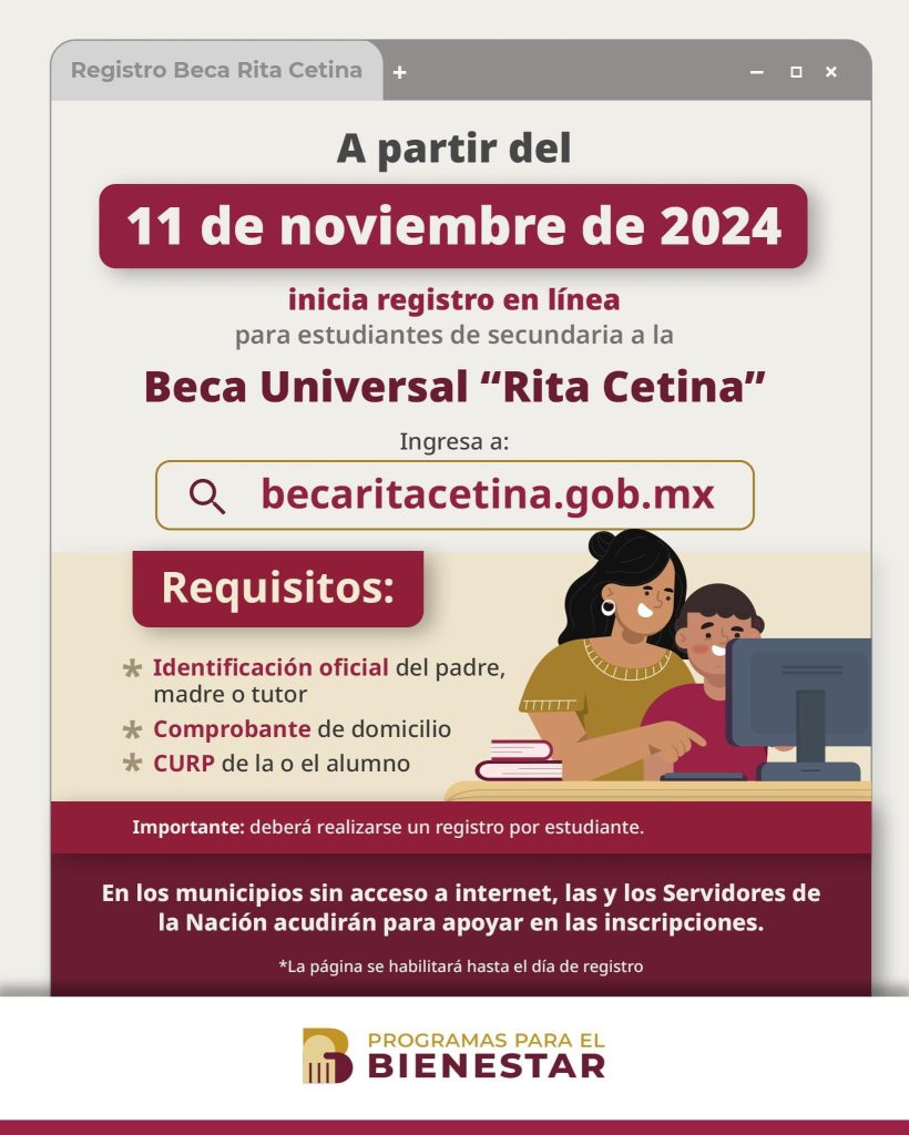 NUEVO LAREDO.- Este 11 de noviembre arrancará el proceso de registro para obtener la nueva beca “Rita Cetina” que otorgará el gobierno federal a estudiantes de educación básica, empezando por los de secundaria.