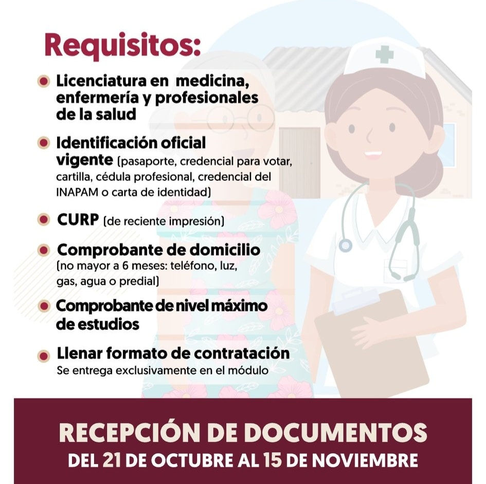 Los requisitos son tener licenciatura en Medicina, Enfermería y profesionales de la salud; identificación oficial vigente, que puede ser el pasaporte, credencial para votar INE, cartilla militar, cédula profesional, credencial del INAPAM o carta de identidad.