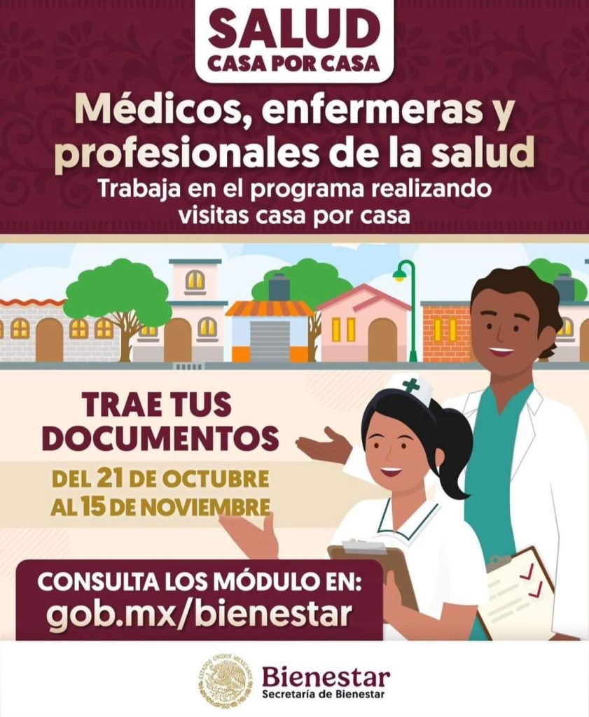 “Atención médicos, enfermeras y profesionales de la salud. ¿Te gustaría trabajar en el programa Salud Casa por Casa? Buenas noticias, estamos contratando”, indica la convocatoria de Bienestar.