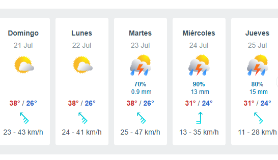 El martes 23 de julio hay un 70 por ciento en probabilidad de lluvia, con temperatura máxima 38 grados centígrados, pero el miércoles 24 de julio la temperatura bajará a 31 grados la máxima y 24 la mínima, además de un 90 por ciento en posibilidad de lluvia.