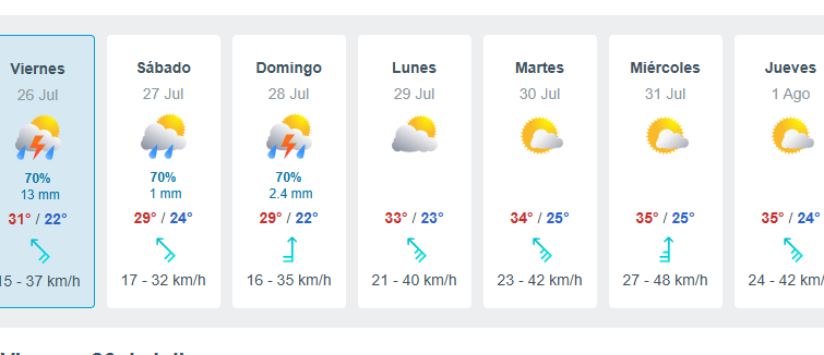 Por ejemplo, el jueves 25 de julio se registrarán 31 grados centígrados y 80 por ciento en posibles lluvias; el viernes 26 una máxima de 31 grados centígrados, el sábado 27 de julio 29 grados al igual que el domingo 28 de julio, también con 70 por ciento en posibles lluvias.
